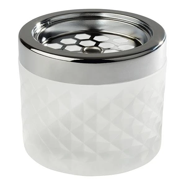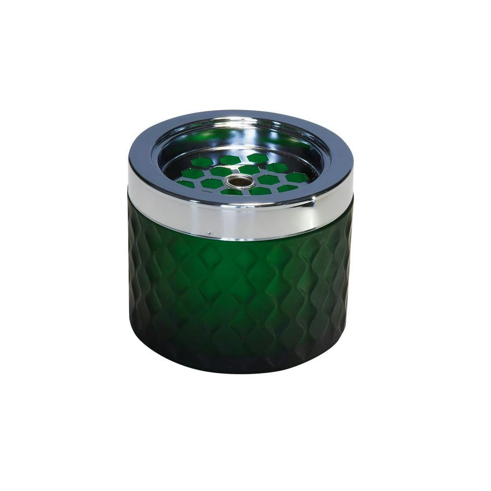 Dieser Windaschenbecher aus verchromten Metall und grünem gefrostetem Glas lässt Asche stilvoll verschwinden. Der Bajonettverschluss schließt stilvoll den Aschenbecher ab. Verchromtes Metall und Glas sind die Grundstoffe für diesen eleganten Windaschenbecher. Chrom ist ein silberweißes, korrosions- und anlaufbeständiges hartes Metall. Der Windaschenbecher ist nicht spülmaschinengeeignet. Es empfiehlt sich, den Deckel abzunehmen und beide Teile mit heißem Wasser und etwas Spülmittel gründlich zu reinigen.